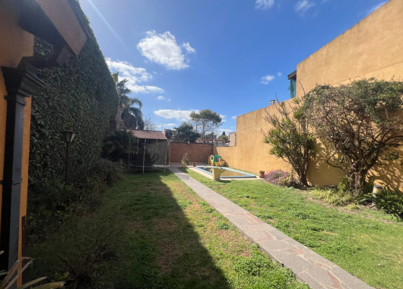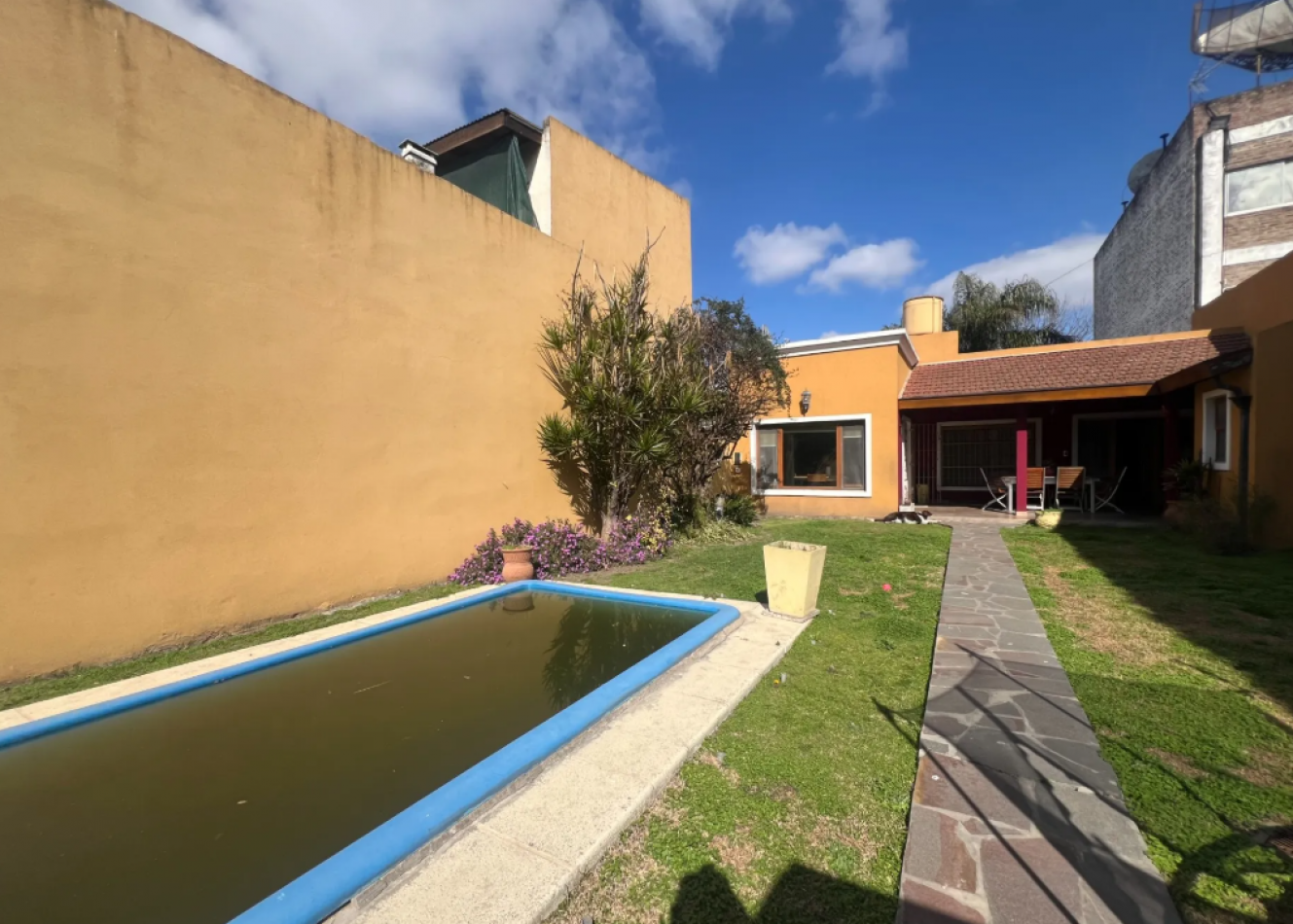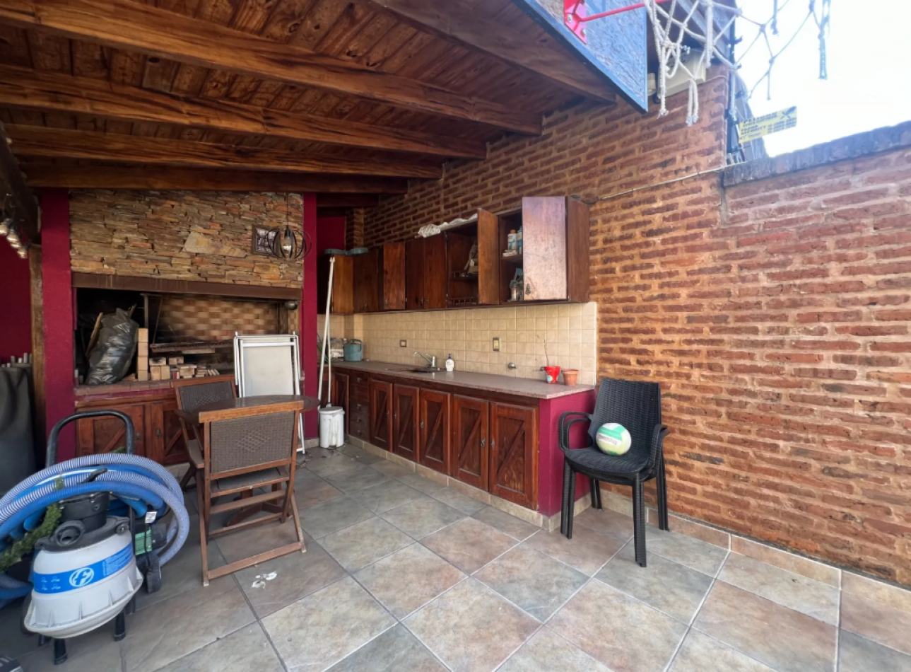 Galería cubierta con espacio de lavadero y baño completo, jardín con pileta y quincho con parrilla en el fondo.