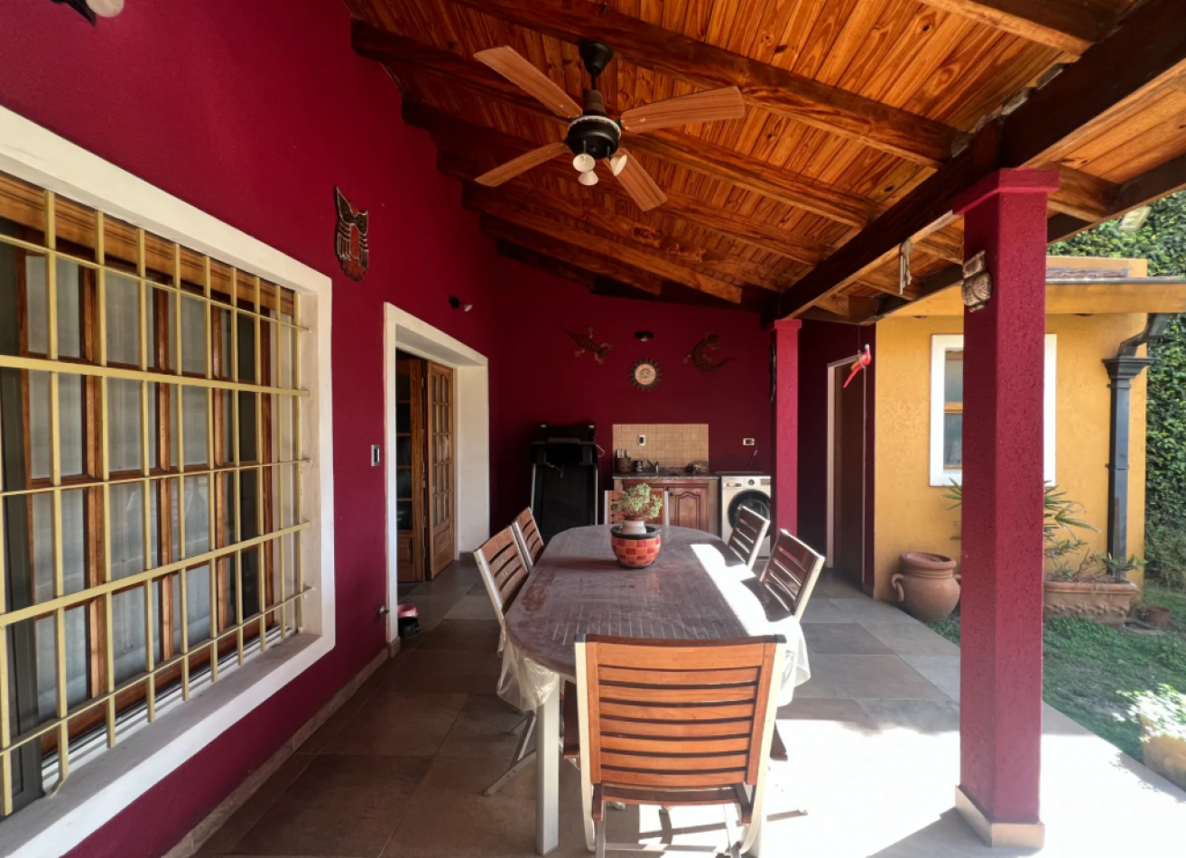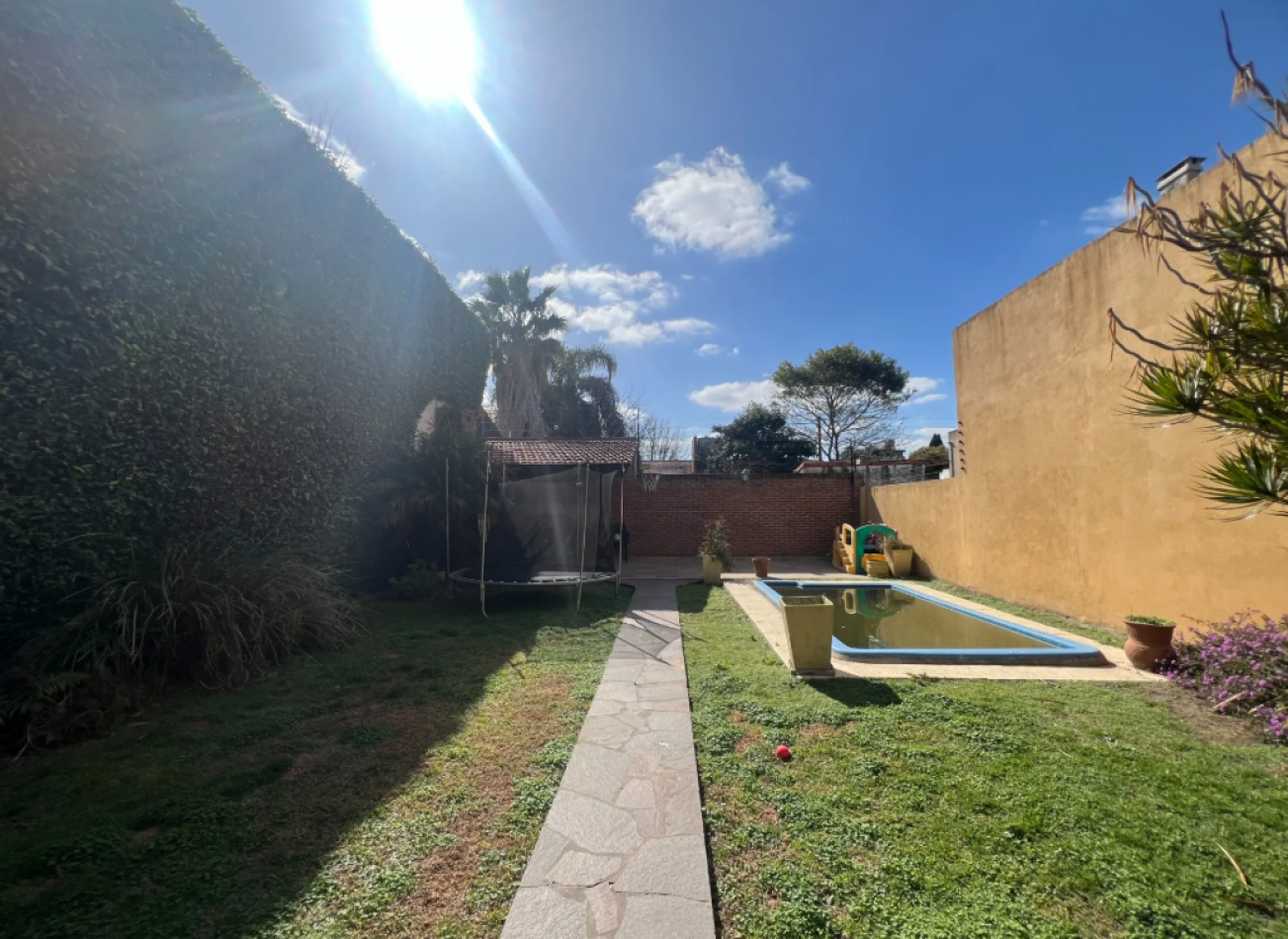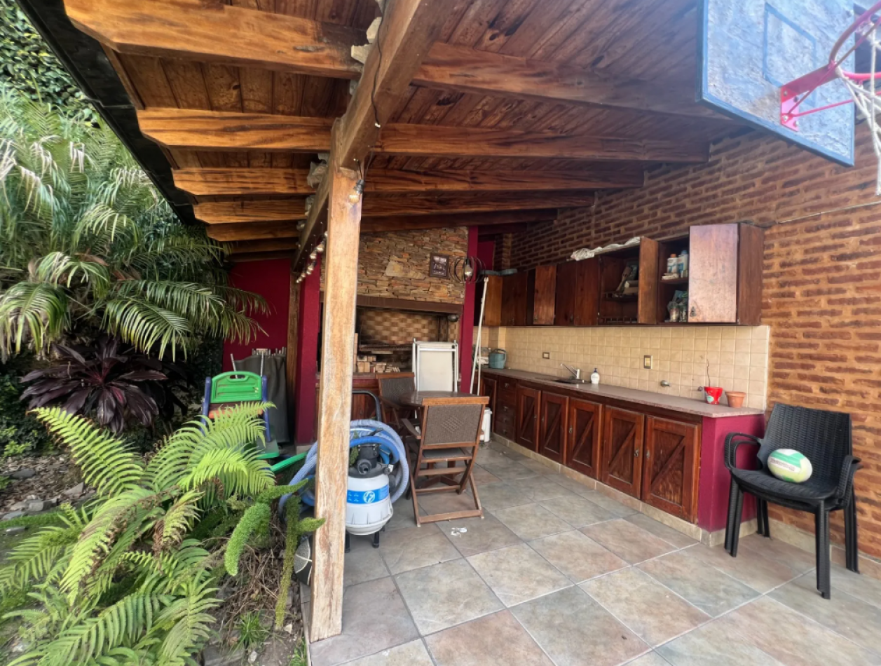Galería cubierta con espacio de lavadero y baño completo, jardín con pileta y quincho con parrilla en el fondo.